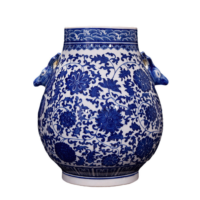 1: Blue and white tangled lotus double-eared Luohan vase: 43x33x9x- cm