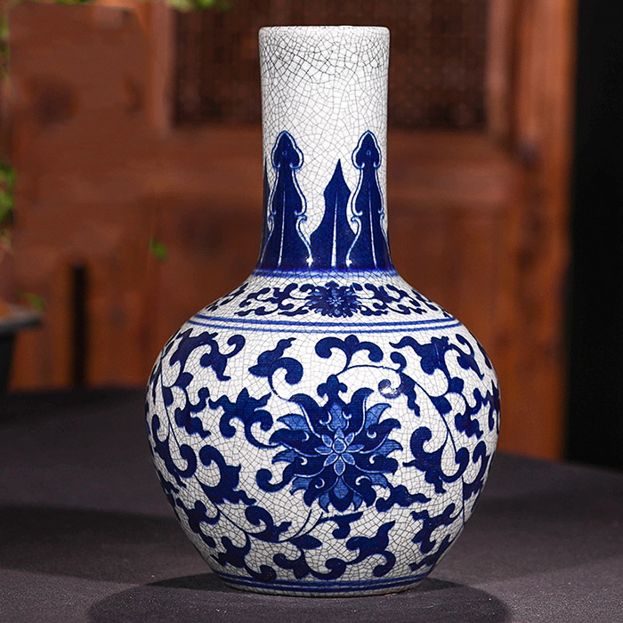 Vase en céramique à glaçure craquelée bleu et blanc de forme céleste