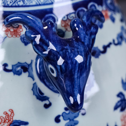 Blue and white deer head double ear blessing bucket large vase