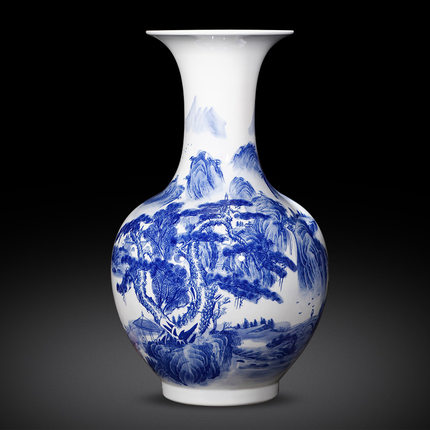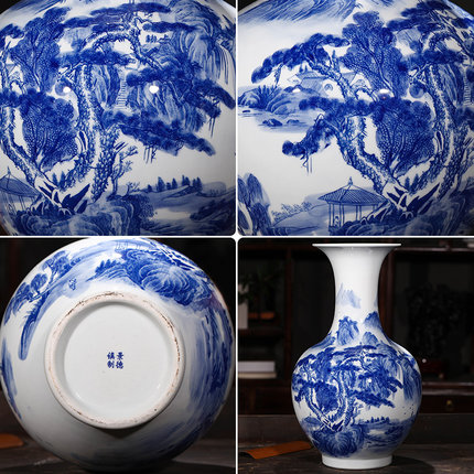 Grand vase de sol en céramique avec peinture de paysage bleu et blanc