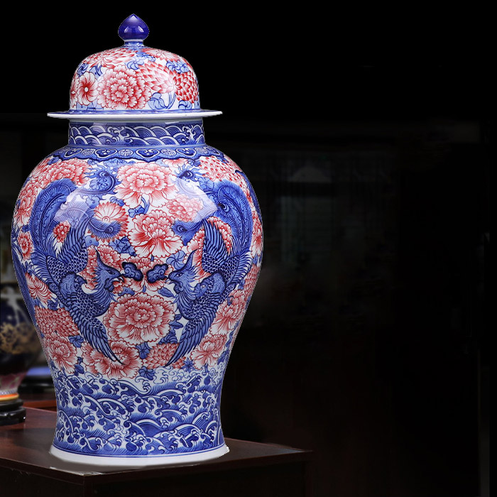 Rouge phénix bleu et blanc peint à la main dans un pot de glaçure