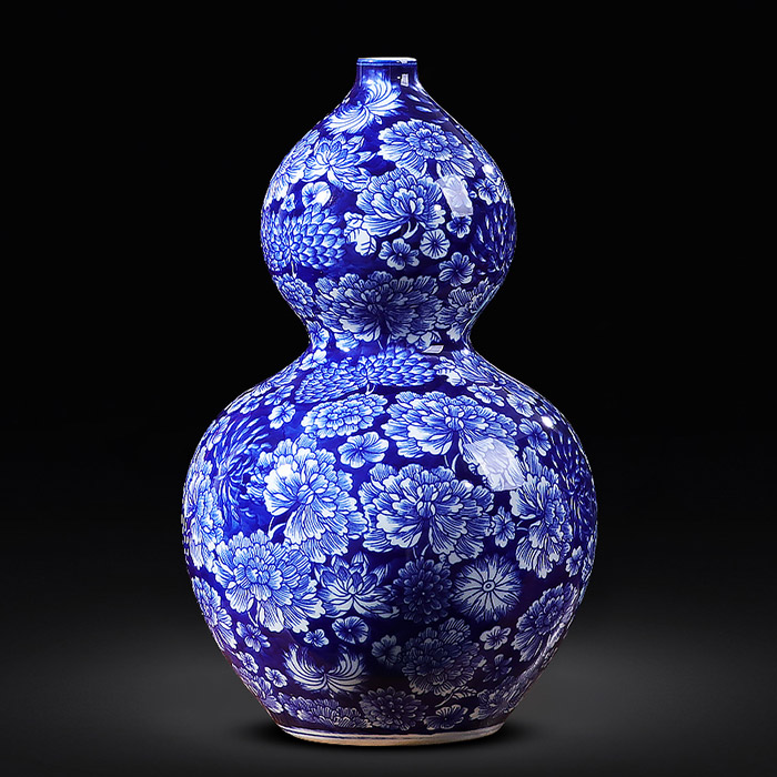 Vase antique en céramique bleu vif et blanc en forme de gourde