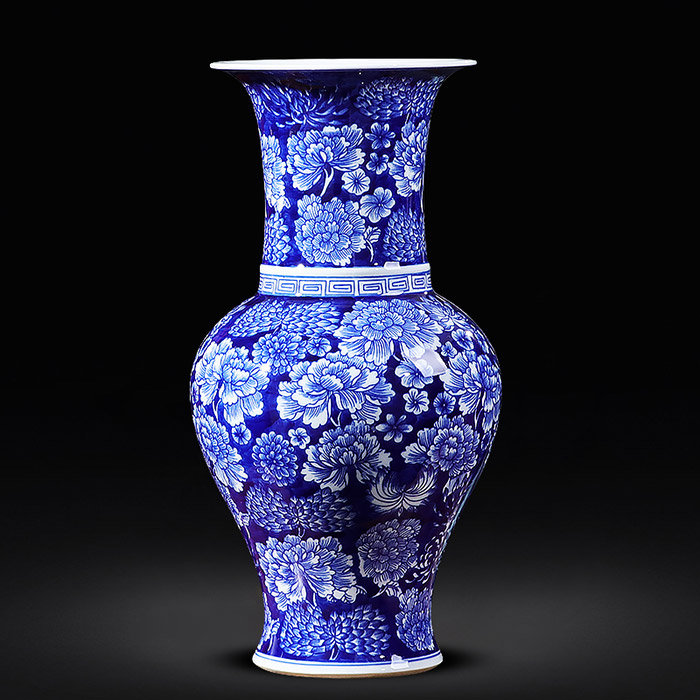 Vases antiques en poterie bleu vif et blanc à col court