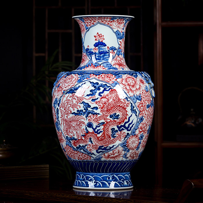 Vase à motif dragon rouge en émail bleu et blanc peint à la main