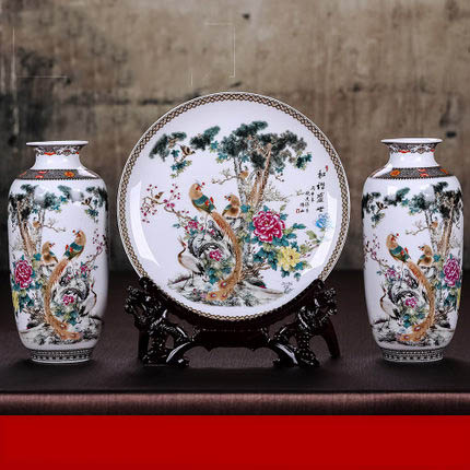 Assiette et vases suspendus en céramique trois pièces oiseaux et arbre